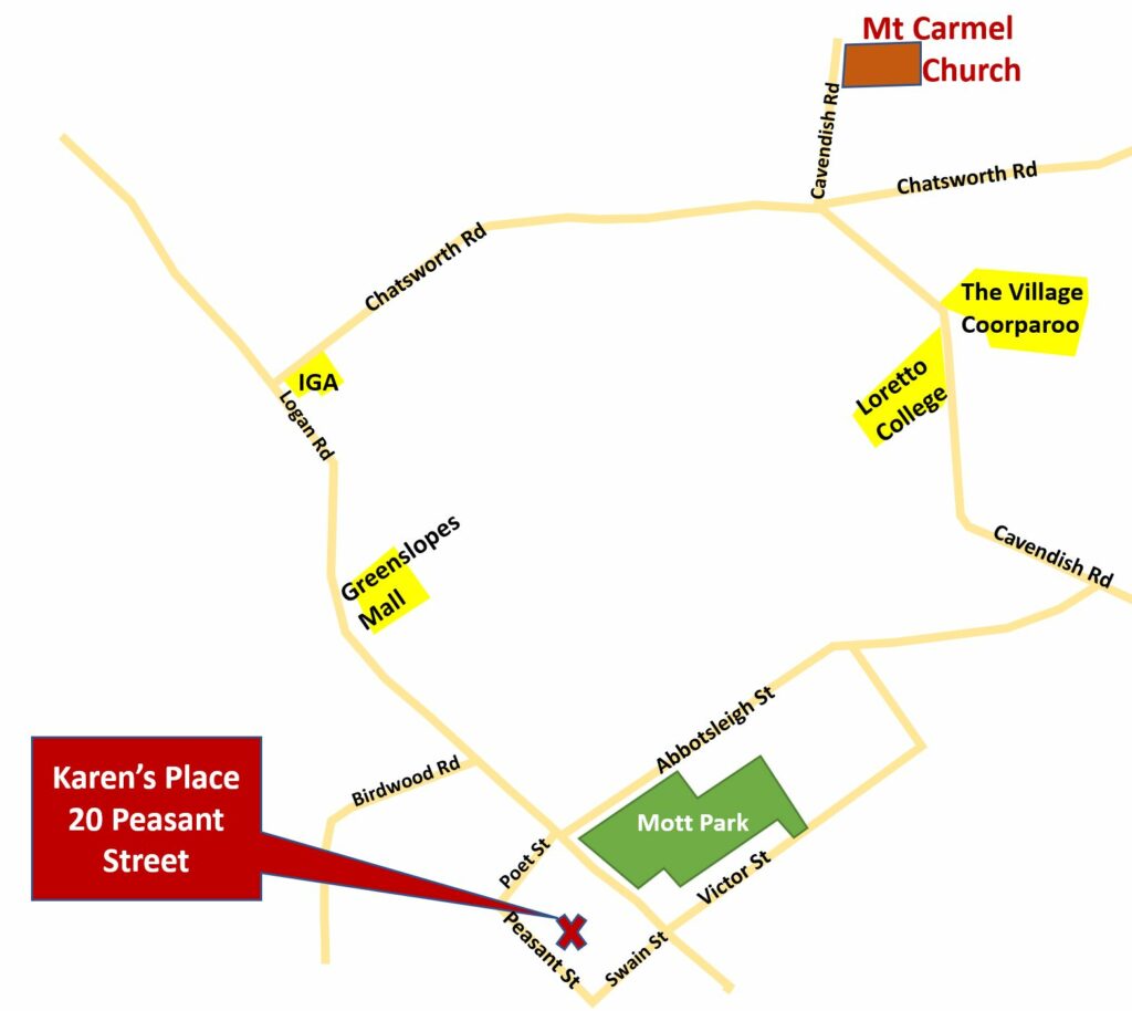 Karen’s home is at 20 Peasant Street, Holland Park West.